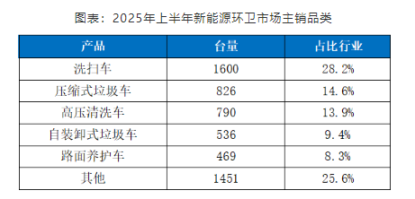从细分产品来看,2025年上半年新能源环卫市场主销品类分别为洗扫车、压缩式垃圾车、高压清洗车、自装卸式垃圾车、路面养护车等,这五大品类合计销售4221台,成为企业竞争的核心焦点。